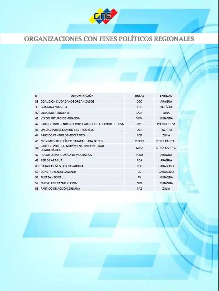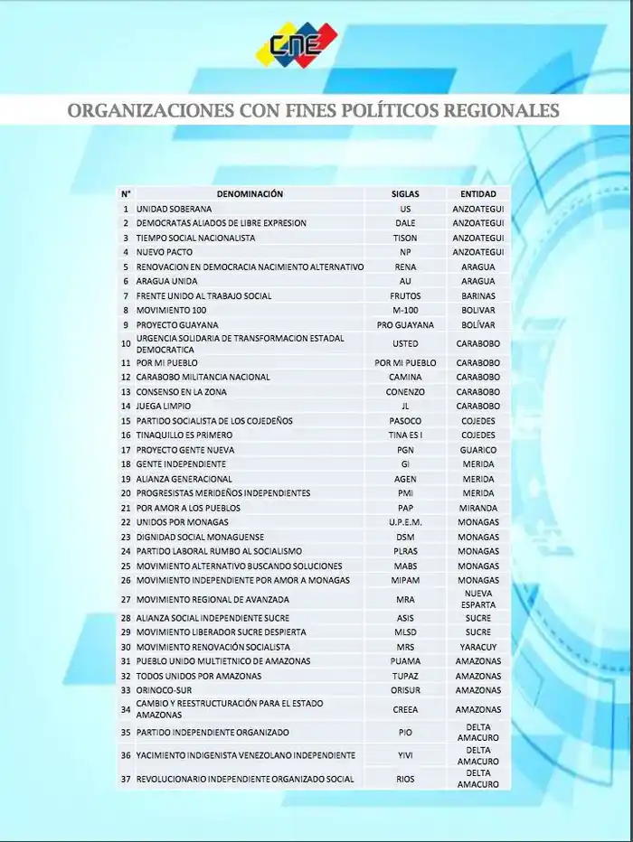 El Consejo Nacional Electoral del régimen difundió este lunes la lista de 105 partidos políticos que podrían participar en las elecciones parlamentarias convocadas para el 6 de diciembre.