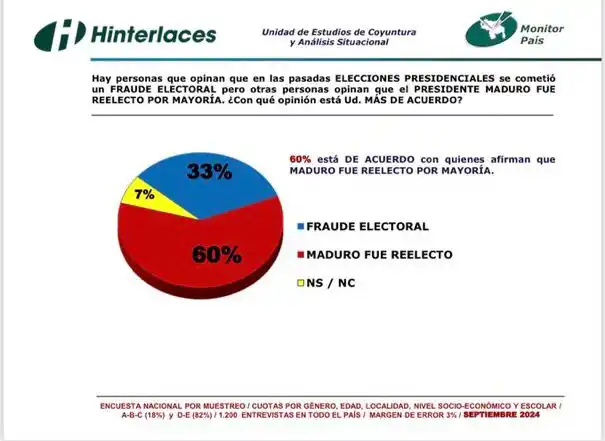 La consultora y firma estadística, @Hinterlaces, aseguró que el 60% de los consultados en un estudio realizado a principio de septiembre afirma que Nicolás Maduro fue reelecto el #28Jul por mayoría