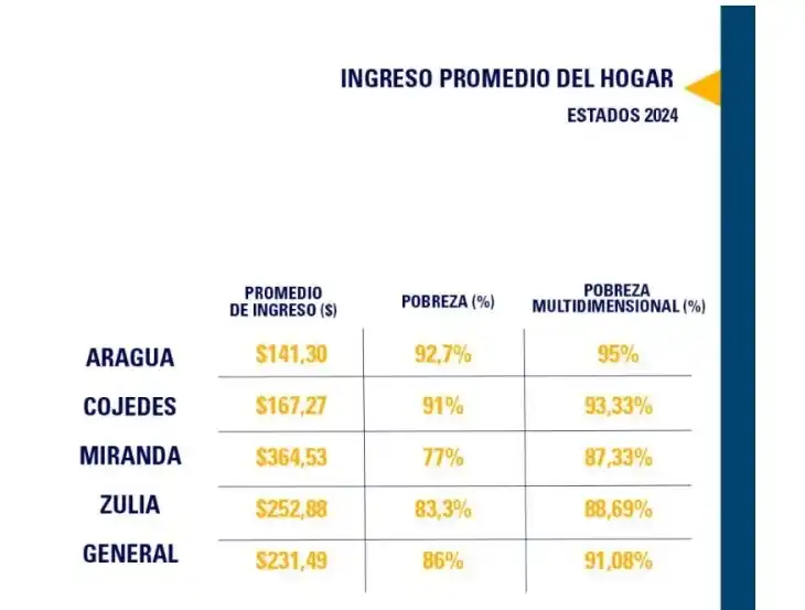 Ingresos y Canasta Alimentaria: El ingreso promedio de los hogares venezolanos es de 231.49 dólares, insuficiente para cubrir el costo de la canasta alimentaria familiar.