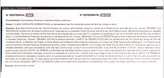 En el resumen de la sentencia, publicada en el sitio web del TSJ, «se ordena notificar a la representante del Movimiento Bolivariano de Familias “Aristóbulo Istúriz”, al Defensor del Pueblo, al Fiscal General de la República Bolivariana de Venezuela, al Ministerio del Poder Popular para la Educación, a la Presidenta del Instituto Autónomo Consejo Nacional de Derechos de Niños, Niñas y Adolescentes (IDENNA) y al Ministerio del Poder Popular para la Salud».
