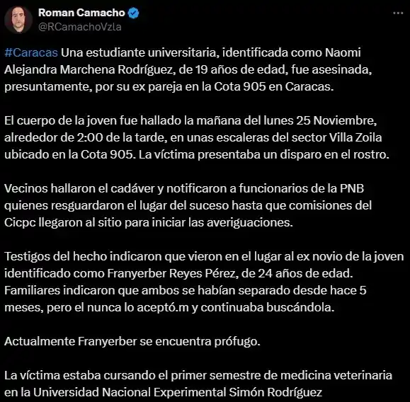Funcionarios del Cuerpo de Investigaciones Científicas Penales y Criminalísticas (Cicpc) abatieron este miércoles al presunto asesino de la estudiante de veterinaria en la Universidad Simón Rodríguez, Nahomi Alexandra Marchena Rodríguez, de 19 años, quien fue encontrada con un disparo en el rostro en unas escaleras de la Cota 905, en Caracas.