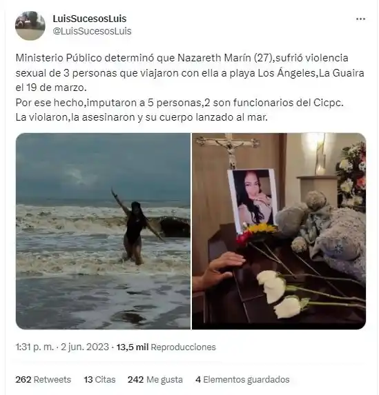 El Ministerio Público (MP) determinó que Nazareth Marín (27) sufrió una violencia sexual ejercida por las tres personas que viajaron con ella a playa Los Ángeles (La Guaira) el 19 de marzo pasado.