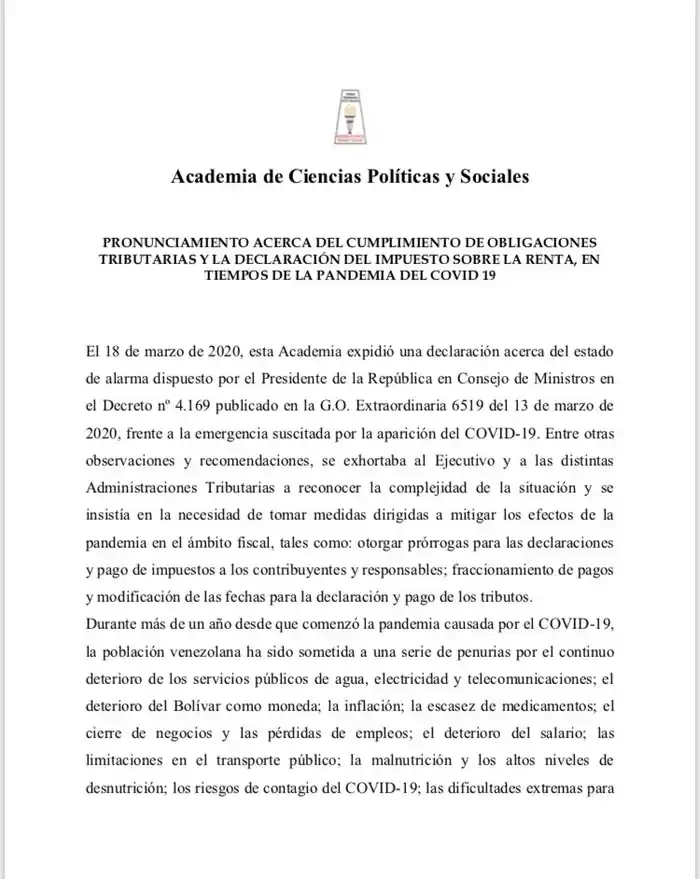 Mediante un comunicado, la Academia de Ciencias Políticas y Sociales, rechazó que la administración de Nicolás Maduro, a través del Seniat puede prorrogar la declaración de la ISLR, como lo ha hecho en otras ocasiones, y más en el contexto del coronavirus. Considera que esa actitud pone en riego la salud de los empleados de los entes recaudadores y de los ciudadanos