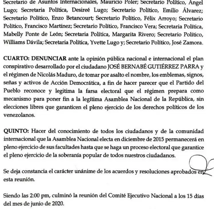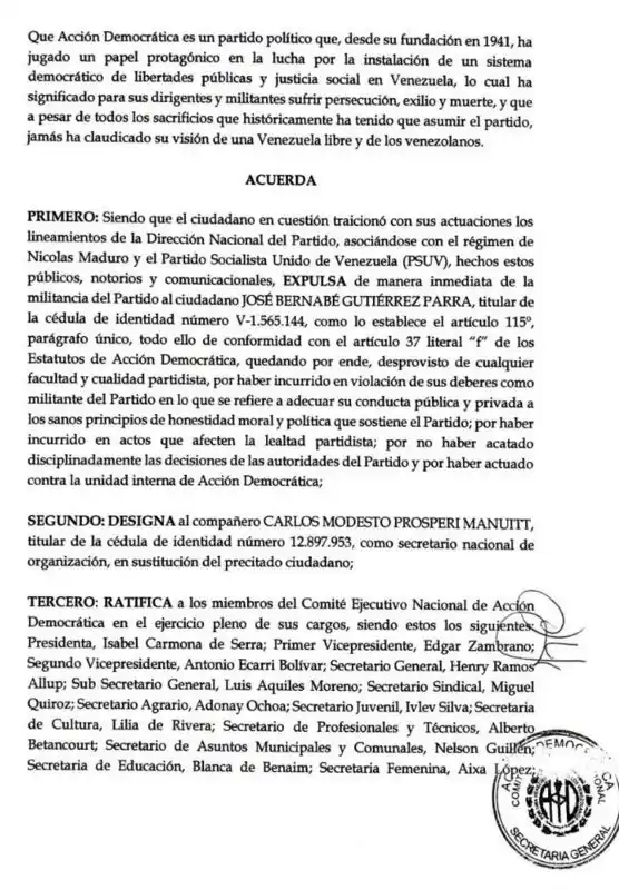«Fracción de diputados de @ADemocratica ante la @asambleave, respalda por unanimidad la decisión del Comité Ejecutivo Nacional del partido donde se acuerda la expulsión del ciudadano Bernabé Gutierrez de sus filas. ¡AD no se vende!», agregaron.