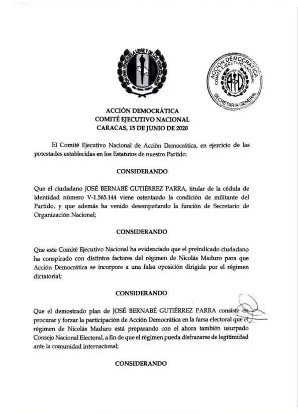 Tras la decisión del TSJ del régimen de destituir a la directiva de Acción Democrática y nombrar a Bernabé Gutiérrez presidente de la junta directiva ad-hoc, las autoridades legítimas de la tolda blanca expulsaron de la militancia al dirigente adeco.