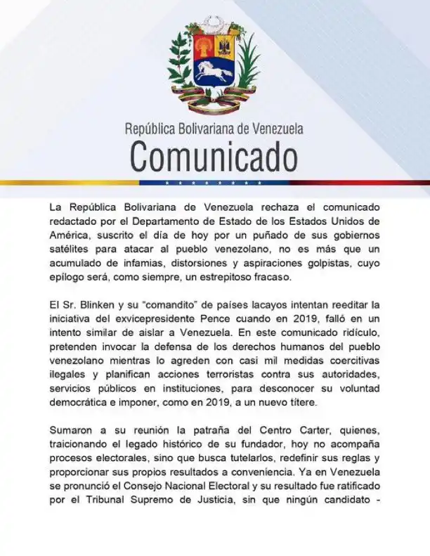 «La República Bolivariana de Venezuela rechaza el comunicado redactado por el Departamento de Estado de los Estados Unidos de América, suscrito el día de hoy por un puñado de sus gobiernos satélites para atacar al pueblo venezolano, no es más que un acumulado de infamias, distorsiones y aspiraciones golpistas, cuyo epílogo será, como siempre, un estrepitoso fracaso», reza el documento oficial.