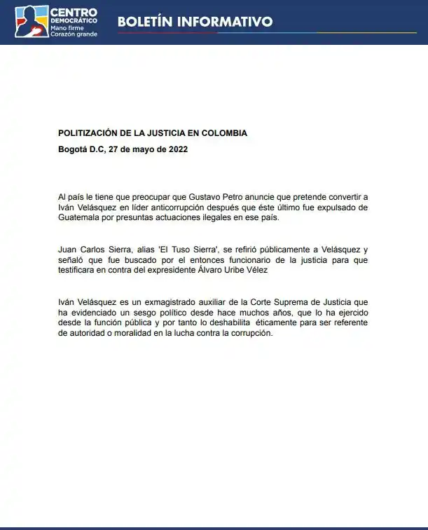 De acuerdo con Mano Firme, Petro convertiría a Iván Velásquez en líder anticorrupción, lo que la tolda política criticó, porque Velásquez fue expulsado de Guatemala por presuntas actuaciones ilegales en ese país. de Guatemala por presuntas actuaciones ilegales en ese país.