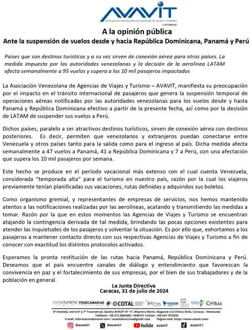 En un comunicado difundido el 31 de julio, Avavit advirtió sobre el impacto de la cancelación de los vuelos hacia esos tres países, por ser estos destinos el enlace para viajes hacia diferentes partes del mundo.