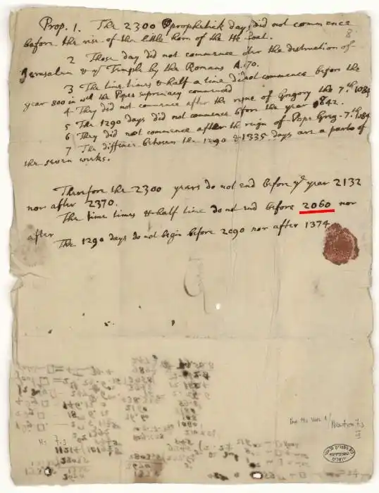 Aunque también dentro del manuscrito, Newton señala las fechas 2090, 2132, 2344 y 2374. Pero el 2060 se ha convertido en el año de su apocalipsis porque aparece en varios momentos de sus cálculos.