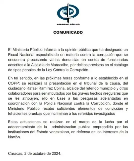 ATENCIÓN ?@MinpublicoVEN emitió un comunicado sobre el caso del alcalde de Maracaibo, Rafael Ramírez, quien fue detenido este martes #1Oct.