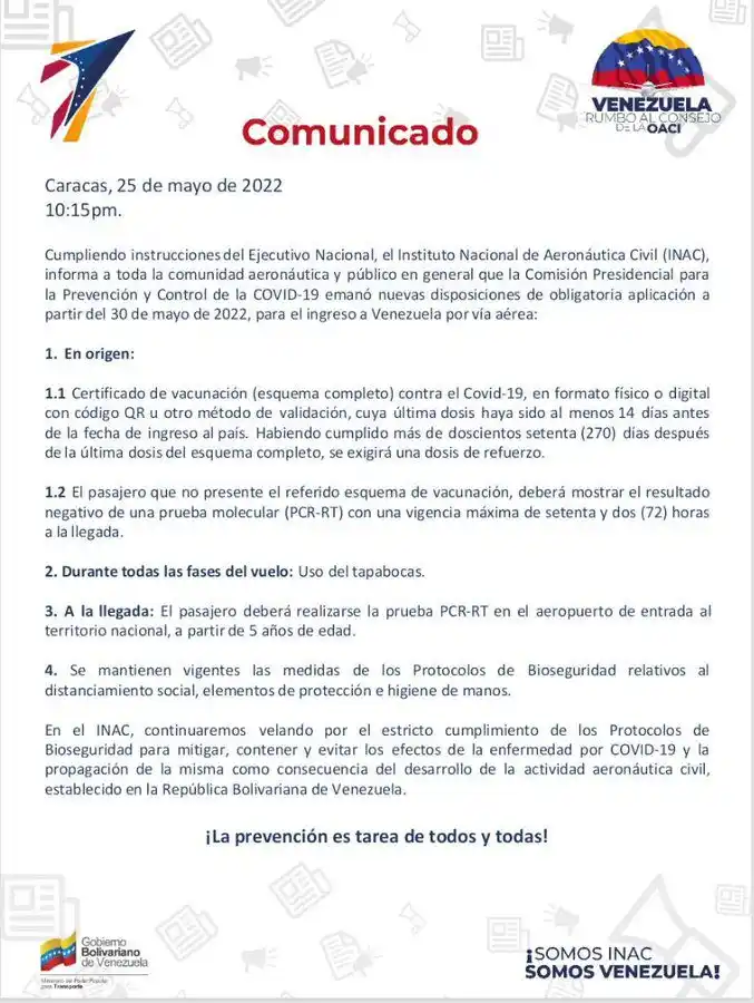 El Instituto Nacional de Aeronáutica Civil (Inac) anunció este miércoles las nuevas normas que regirán para el ingreso a Venezuela por vía aérea, a partir del 30 de mayo.