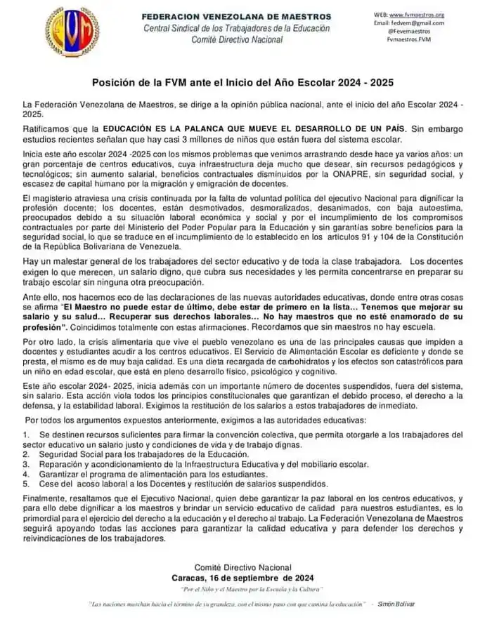 En el escrito, publicado en sus redes sociales, la FVM advierte que «este año escolar 2024-202, inicia además con un importante número de docentes suspendidos, fuera del sistema, sin salario».