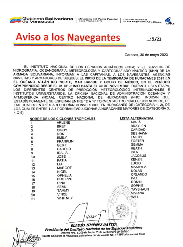 Instituto Nacional de los Espacios Acuáticos (INEA) emitió una alerta de prevención a los navegantes, agencias navieras y armadores de buques de Venezuela por el inicio de la temporada de huracanes que se producirán entre este 1 de junio y el 30 de noviembre de 2023.