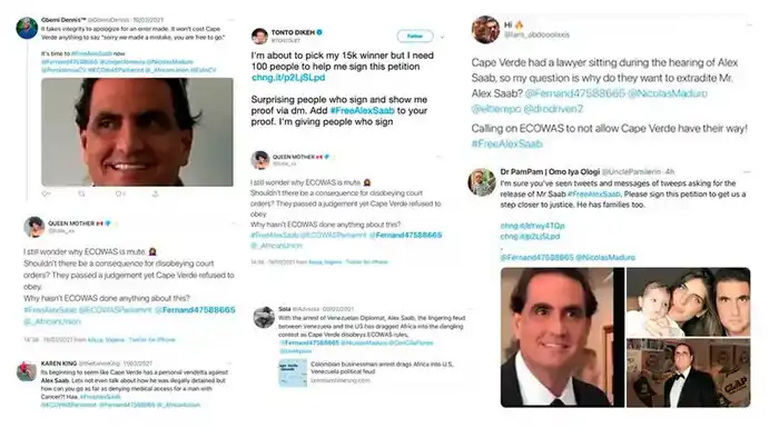 Pagaban a sus usuarios de Twitter para que escribieran sobre la detención de Saab e influenciar a la opinión pública y a los procesos judiciales de Nigeria y Cabo Verde.