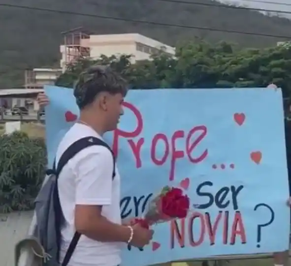Las imágenes muestran cómo el estudiante le llevó música a la educadora y le hizo una gran pancarta. La misma decía: «Profe… ¿quiere ser mi novia?».
