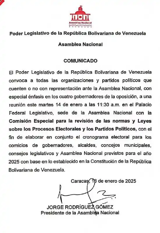 También destaca que la finalidad es «elaborar en conjunto el cronograma electoral para los comicios de gobernadores, alcaldes, concejos municipales, consejos legislativos y Asamblea Nacional previstos para el año 2025, con base en lo establecido en la Constitución».