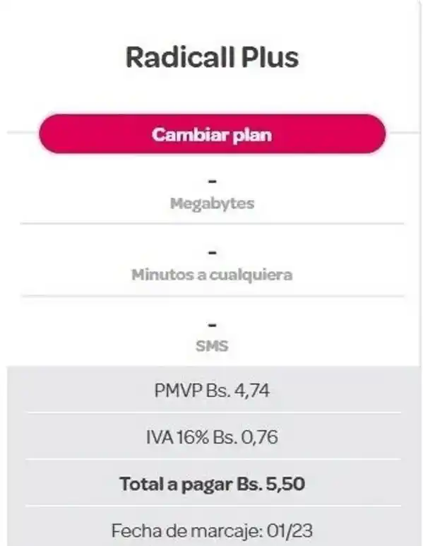 Radicall Plus: Bs 5,50. Por consumo. Precio incluye IVA