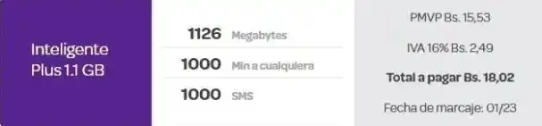 Este plan cuesta Bs 18,02, conformado por 1.126 megabytes, 1000 minutos a cualquier operadora y 1000 mensajes de texto (SMS). Precio incluye IVA