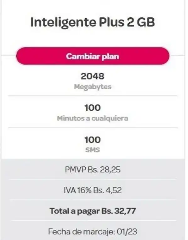 Este plan cuesta Bs 32,77 y que consta de 2.048 megabytes, 100 minutos a cualquier operadora y 100 mensajes de texto (SMS). Precio incluye IVA