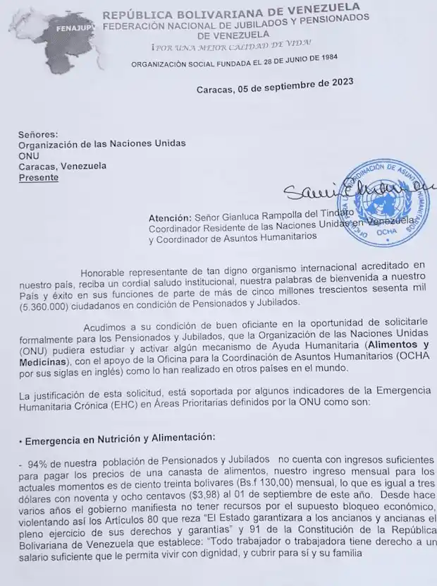 La Federación de Jubilados y Pensionados acudió a la sede en Caracas del Programa de las Naciones Unidas para el Desarrollo (PNUD), para consignar un documento donde solicitan «activar algún mecanismo de ayuda humanitaria» para este sector que engloba a más de 5 millones de venezolanos.