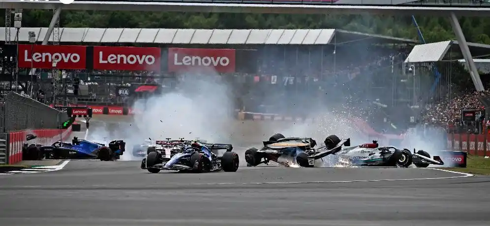 El Mercedes de George Russell, Esteban Ocon de Alpine, Yuki Tsunoda (Alpha Tauri) y el Williams de Alex Albon también estuvieron involucrados en el choque que provocó un retraso de una hora con bandera roja.