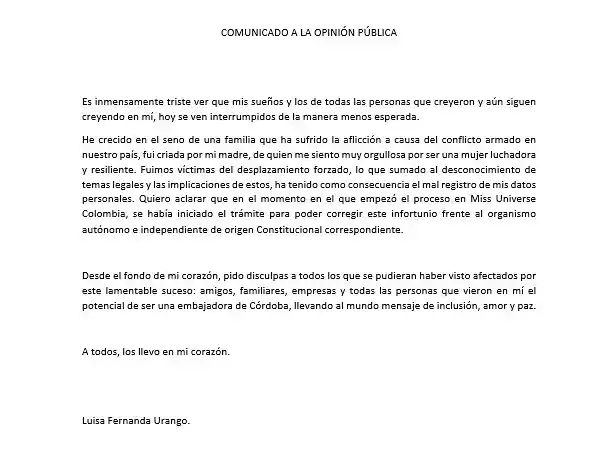 El otro caso fue el de quien era representante de Córdova, Luisa Fernanda Urango. Ella fue destituida por las autoridades del Miss Universe Colombia «luego de confirmar que entregó documentación alterada; en la que acredita una edad de la que realmente tiene».