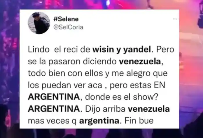 “Lindo el reci de Wisin y Yandel, pero se la pasaron diciendo Venezuela. Todo bien con ellos y me alegro de que los puedan ver acá, pero estás en ARGETINA. ¿Dónde es el show? Dijo arriba Venezuela, más veces que Argentina”, es uno de los mensajes que expusieron los internautas.