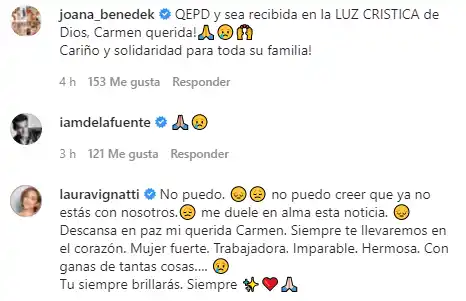 Laura Vignatti, por su parte, escribió uno de los más sentidos mensajes en la misma red social. «No puedo. No puedo creer que ya no estás con nosotros. Me duele en alma esta noticia. Descansa en paz mi querida Carmen. Siempre te llevaremos en el corazón. Mujer fuerte. Trabajadora. Imparable. Hermosa. Con ganas de tantas cosas…. Tú siempre brillarás. Siempre».