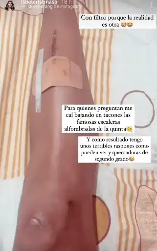 Este sábado 8 de octubre, Isbel compartió que el doctor Franco, dermatólogo que la trata, le hace un tratamiento especial para la buena cicatrización. También el médico explicó por qué la herida es tratada como una quemadura de segundo grado. «El traumatismo que sufriste causó una herida expuesta, similar a la que se ve en las quemaduras. Por eso es importante tratarla como tal, a fin de garantizar una adecuada cicatrización y pigmentación de la piel».