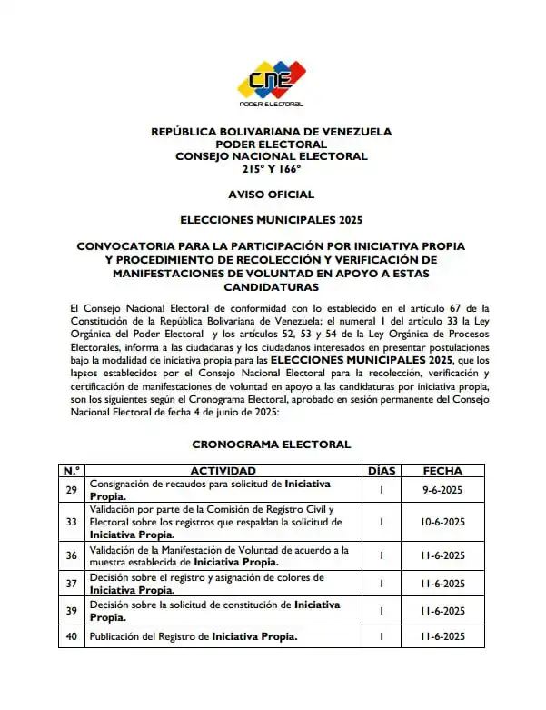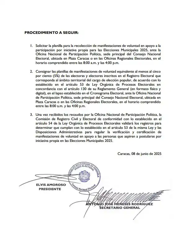 A través de su canal en Telegram, el CNE informó que los ciudadanos interesados en postularse por iniciativa propia podrán solicitar la planilla para la recolección de manifestaciones de apoyo a partir del lunes 9 de junio.