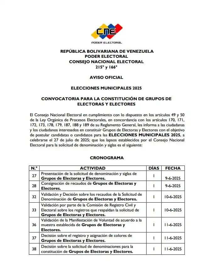 El Consejo Nacional Electoral (CNE), publicó los cronogramas oficiales para las postulaciones bajo la modalidad por iniciativa propia y para la constitución de grupos de electores que presentarán candidatos en las elecciones municipales del 27 de julio.