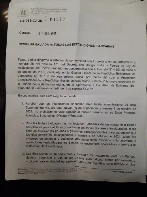 Uno de los primeros anuncios que hizo la Sudeban es que el 30 de septiembre y 1 de octubre las entidades bancarias no prestarán servicio regular. Esto, debido a la adecuación de sus sistemas a la reconversión.