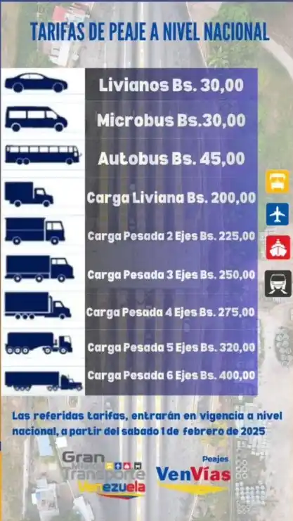 A partir del 1 de febrero de 2025 entra en emergencia nuevas tarifas del peaje a nivel nacional que van entre los Bs. 30 y los Bs. 400 de acuerdo al tipo de vehículo que circule por las principales vías del país.