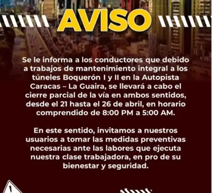 La autopista Caracas-La Guaira está parcialmente cerrada desde la noche de este lunes 21 de abril, en ambos sentidos, por mantenimiento en los túneles Boquerón I y II.