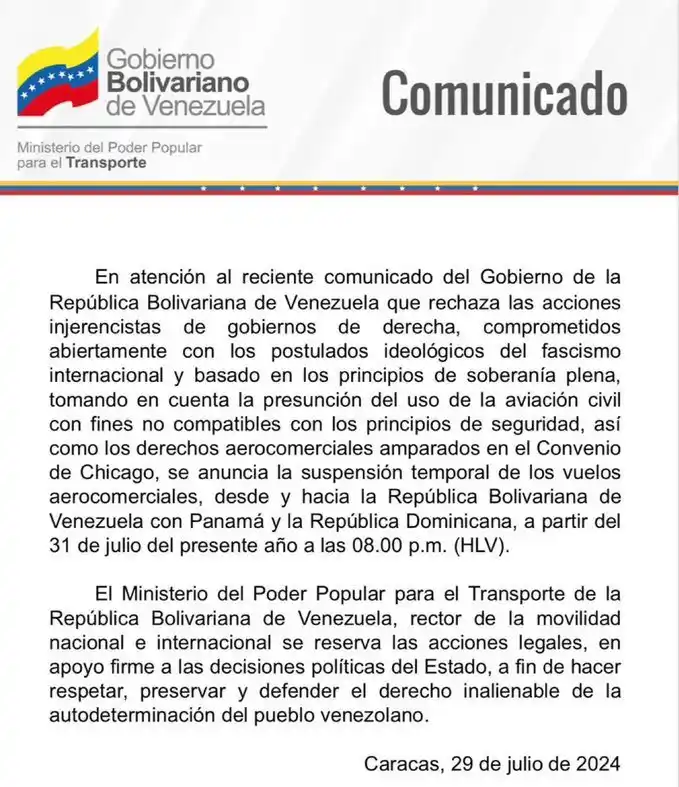 #COMUNICADO ✈️@InacVzla anunció la suspensión temporal de los vuelos aerocomerciales, desde y hacia la República Bolivariana de Venezuela con Panamá y la República Dominicana.