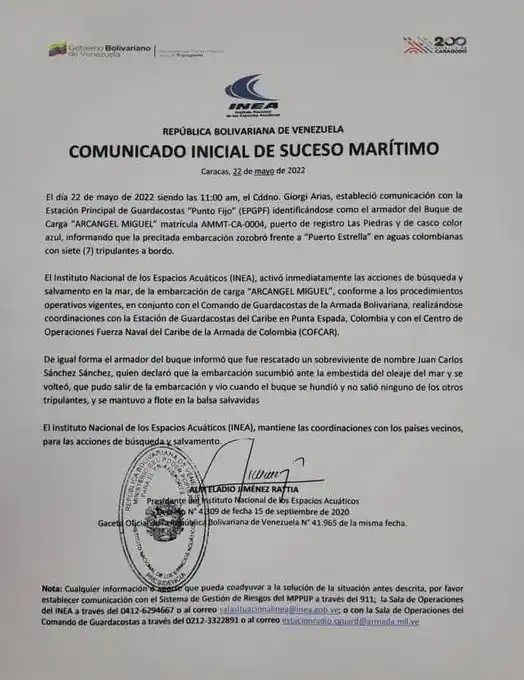 En un comunicado difundido, el organismo detalló que se trata del buque de carga llamado Arcángel Miguel, identificado con la matrícula AMMMT-CA-0004, que zozobró la mañana de este domingo frente a la zona denominada Puerto Estrella, en Colombia.