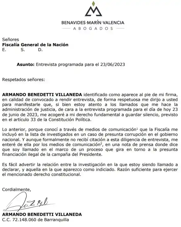 Según Armando Benedetti, no recibió una citación formal a esta diligencia de entrevista. Aseguró haberse enterado por los medios de comunicación.