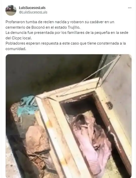 El cuerpo de una bebé recién nacida que fue enterrado el pasado jueves 18 de mayo desapareció de manera inexplicable del cementerio municipal de Boconó, presuntamente con la intención de hacer actos de brujería.