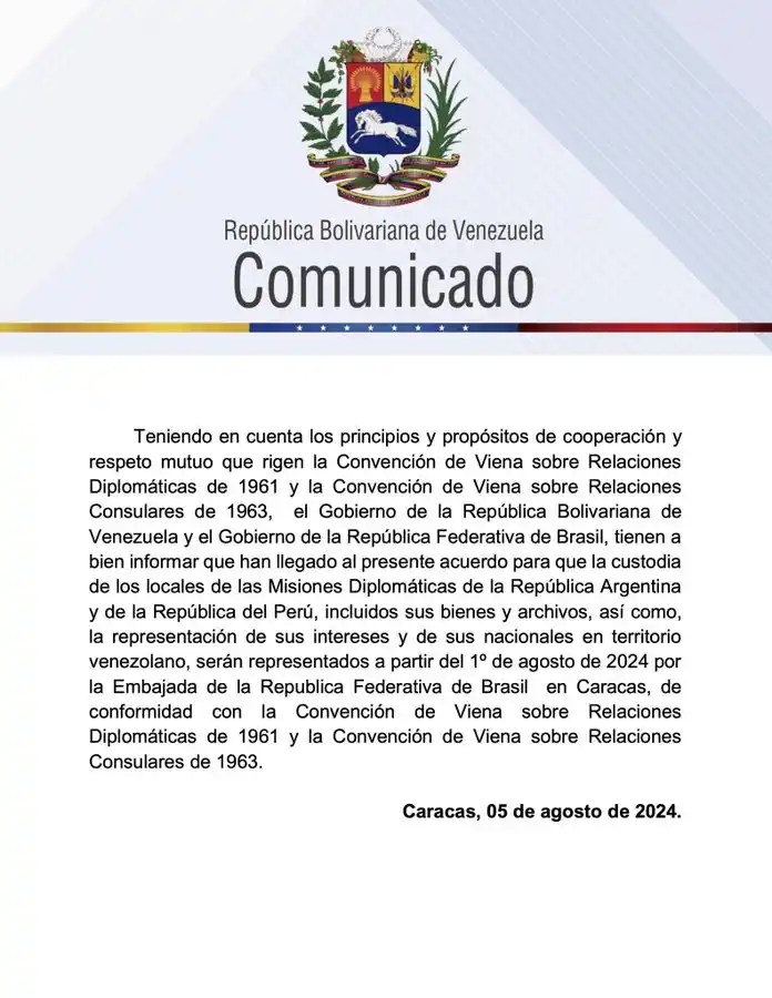 El mismo destaca que a partir de la fecha mencionada, la embajada de Brasil en Caracas asume además la custodia de los bienes y archivos de ambas naciones, en el país.