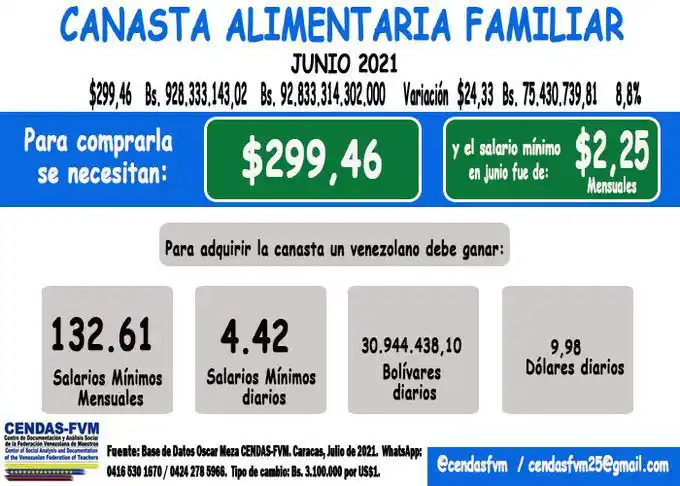 Traducido a la cruda realidad del venezolano común, ese mes se necesitaron 132.61 salarios mínimos de Bs. 7.000.000. Esto es, un promedio de 4.42 salarios mínimos diarios. En comparación con mayo, la variación o aumento en el precio de la comida es de 24,33 dólares o 75.430.793,81 bolívares.