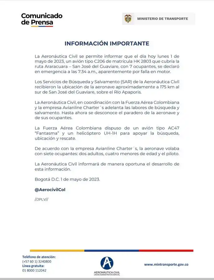 “La Aeronáutica Civil se permite informar que el día hoy lunes 1 de mayo de 2023, un avión tipo C206 de matrícula HK 2803 que cubría la ruta Araracuara – San José del Guaviare, con 7 ocupantes, se declaró en emergencia a las 7:34 a. m., aparentemente por falla en motor”, indicó la Aerocivil en un comunicado.