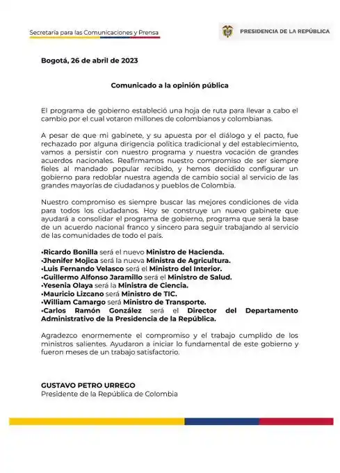 Tras pedir la renuncia protocolaria a todos sus ministros, el presidente Petro dio a conocer la salida del gabinete de la ministra de las TIC, Sandra Urrutia; Carolina Corcho, ministra de Salud; José Antonio Ocampo, ministro de Hacienda; Cecilia López, ministra de Agricultura; Alfonso Prada, ministro del Interior; Guillermo Reyes, ministro de Transporte; y Arturo Luna, ministro de Ciencia.