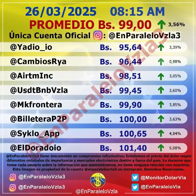 Según la página @enparalelovzla, la divisa sufrió otro incremento en solo horas, equivalentes a 3,56%, desde el cierre del martes, cuando se ubicó en Bs.95,50.