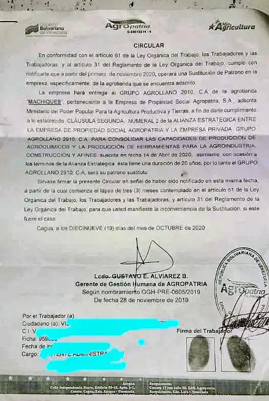 La información se conoció a través Twitter, específicamente, mediante el usuario de tendencia chavista @latabla. A los trabajadores de Agropatria se les notificó que su patrono es otro, pero no tienen claro si sus condiciones laborales cambiaron.