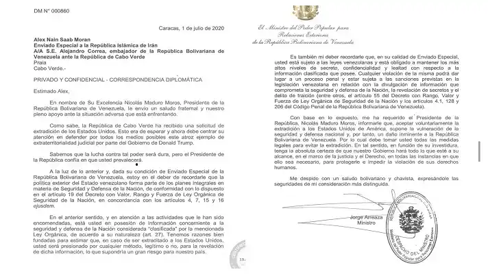 Jorge Arreaza, canciller de Nicolás Maduro, envió una carta a Alex Saab, el 1 de julio del 2020. Ese día, el testaferro de Maduro cumplía 18 días de detenido en Cabo Verde. En la misiva, Arreaza le recuerda a Saab que por ser enviado especial maneja información clasificada sobre Venezuela. También le dice que está obligado a guardar silencio sobre eso, por aquello de la confidencialidad.