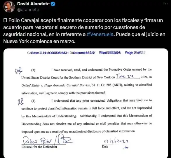 El comunicador social publicó en sus redes sociales una imagen del documento firmado por Carvajal para respetar el secreto sumarial del caso por un tema de seguridad nacional sobre Venezuela y adelanta que posiblemente el juicio contra el general retirado comience en marzo de 2025.