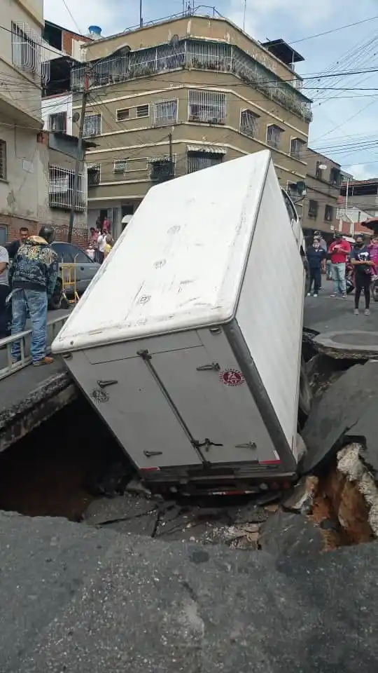 Un camión cargado con productos prácticamente fue tragado por un hueco que se abrió en la calle El Estadio de Altavista, en Catia, la mañana de este martes #26Oct.
