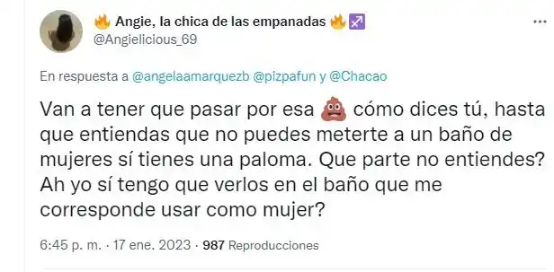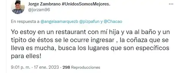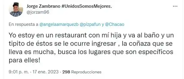 «¿Hasta cuándo vamos a tener que pasar por este mier… las personas trans para poder encontrar espacios seguros para poder hacer sus necesidades sin que nadie te violente? ¿Hasta cuándo tenemos que pasar por esto? Me siento realmente abrumada porque había tenido un día muy bonito y terminé con esto», señaló.