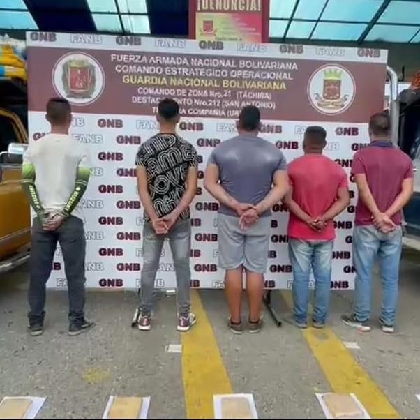Efectivos de la Guardia Nacional detuvieron a cinco hombres en el municipio Pedro María Ureña del estado Táchira, en la frontera con Colombia. Llevaban con 20 panelas de marihuana distribuidas en dos vehículos de carga pesada.