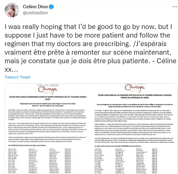 Dion, cuyos shows tuvieron que ser pospuestos debido a la pandemia, ya había cancelado presentaciones programadas en Las Vegas, oeste de Estados Unidos, entre noviembre de 2021 y febrero de 2022.